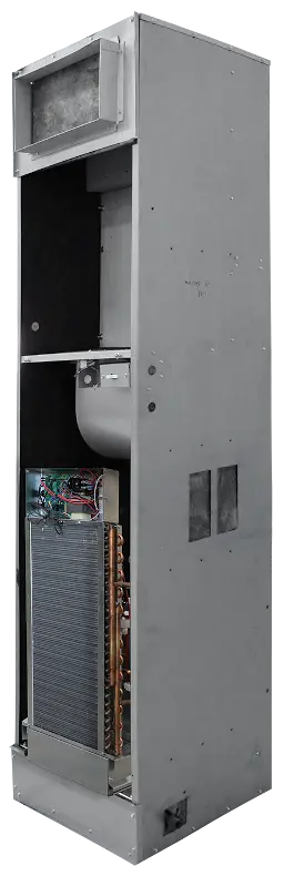 Our Hybrid Vertical Stack Heat Pump combines the cooling power of a heat pump with the heating efficiency of a fan coil. Cooling is achieved through a refrigerant compressor and DX coil that distribute air throughout the suite with the help of a fan. Heating is provided by an efficient hot water coil connected to a building-wide hot water riser and boiler system. The air passes through the coil and is circulated throughout the suite by another fan. Compared to using a compressor, hydronic heating is much more energy-efficient and requires less mechanical maintenance, providing greater reliability.