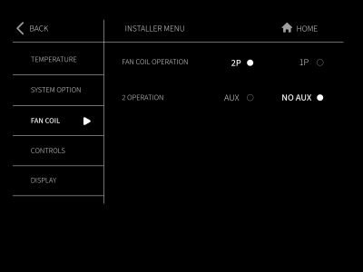 Note: If the fan coil is equipped with an aquastat you must select “4P”, even if you are connecting a 2-pipe fan coil.